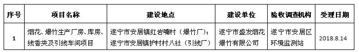 根据建设项目竣工环境保护验收管理有关规定,2018年8月14日,我局受理了1个建设项目竣工环境保护验收申请。现将受理情况予以公告。如有建议意见,请于2018年8月18日前向我局提出。