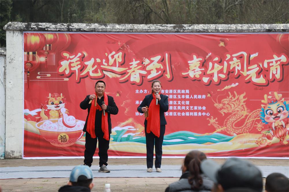 “走走走!看节目去。”2月20日,由安居区民政局、区玉丰镇人民政府主办,区文化馆、区民间文艺家协会承办,以“祥龙迎春到·喜乐闹元宵”为主题的表演活动在区社会福利服务中心集中为供养特困老人开展,陪伴老人们度过一个充满欢笑与温情的节日,并营造了欢乐祥和的节日氛围。