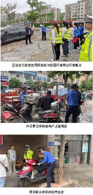 一是现场研讨,高位统筹。5月8日由城管办召开现场会议,统筹协调。区交警大队、区市场监管局、区综合行政执法局、凤凰街道办联合发力,集中整治四小周边的环境秩序。