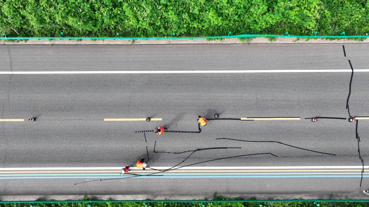 数名养护工人正进行路面裂缝修补