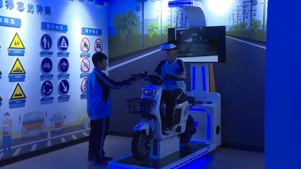 “这里是一个骑车场景的虚拟体验,可以通过驾驶模型车,带上虚拟眼镜,沉侵式体验……”安居一中的陈浩宇同学在讲解员的帮助下正在进行模拟体验。