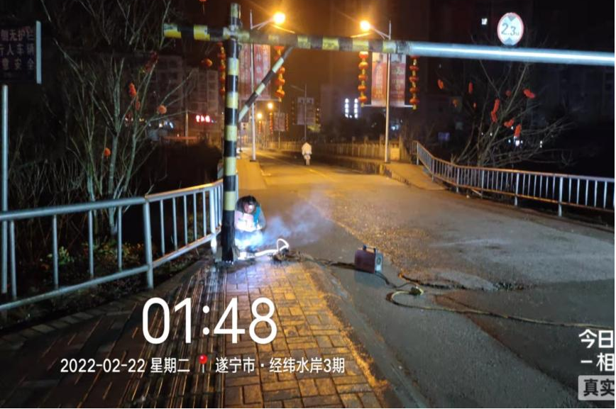 为消除隐患,避免发生安全事故,我局立即采取应对措施。一是马上安排工作人员到桥头值守,提醒过往市民及车辆通行安全,并设置安全警戒带。二是通过人工巡查、天网监控、交通事故中心查找肇事车辆,恢复该限高杆,但均未果。三是联系专业焊工及维修机械对其维修处理,工作人员不分昼夜、无惧寒冷苦累,历经10小时终于完成该限高杆维修作业,排除安全隐患,确保行人及车辆通行安全。