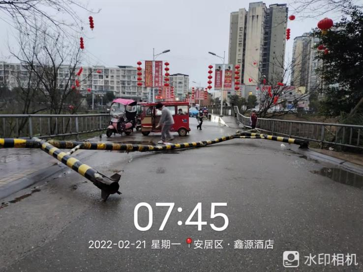 2022年2月21日,我局巡查人员发现安居城区老大桥南端限高杆被车辆撞坏,限高杆出现倾斜、脱落等情况,存在安全隐患。