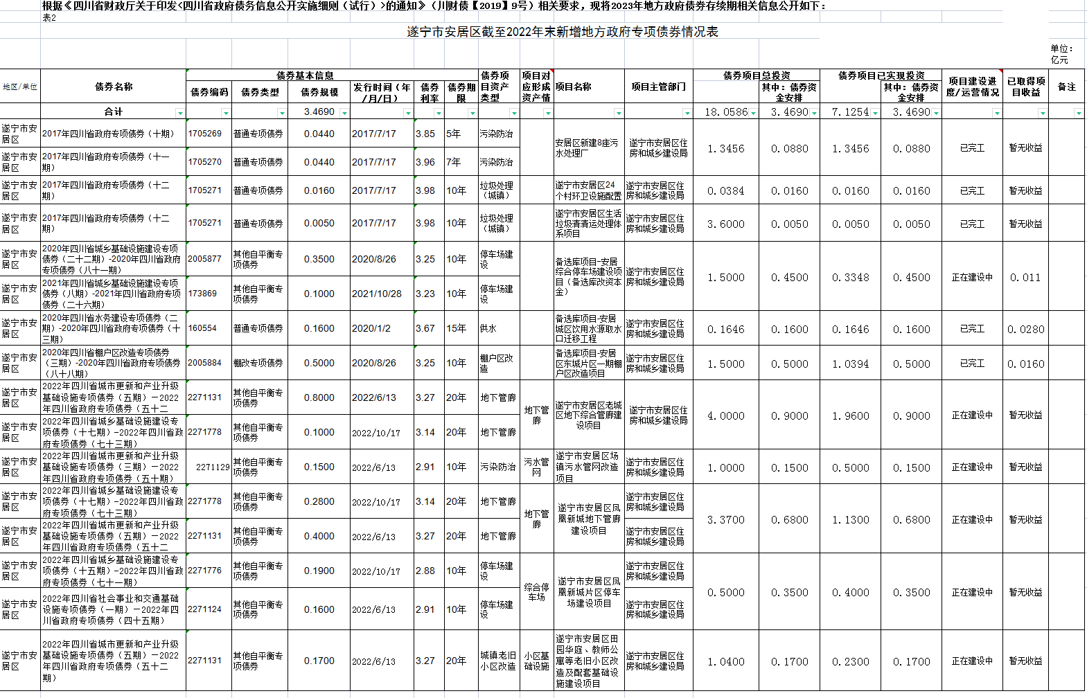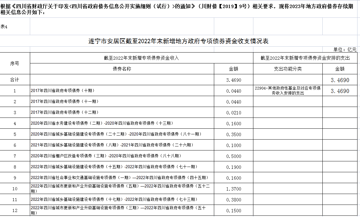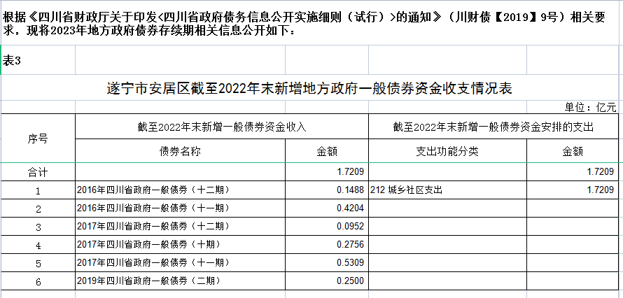 住建局2023年度遂宁市安居区新增地方政府债券存续期信息公开表