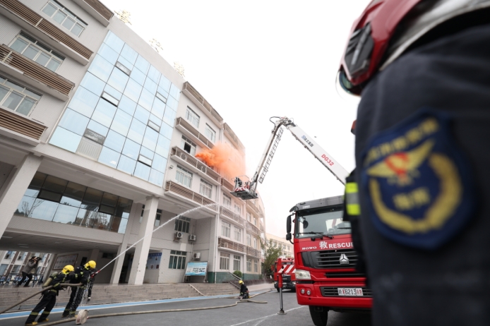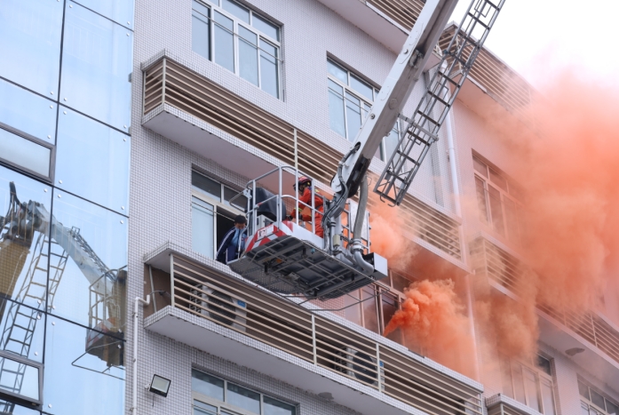 消防员正在演练利用云梯救援被困学生