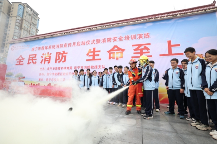这是遂宁市教体系统消防宣传月启动仪式暨消防安全培训演练现场,活动由遂宁市教育体育局、遂宁市消防救援支队联合开展,各县(市、区)教育体育局、市直园区社事局、市直属学校、安居区消防救援大队、安居区部分中小学校、幼儿园相关负责同志参加演练,旨在进一步提高全市广大师生消防安全意识和逃生自救能力,打造平安校园。