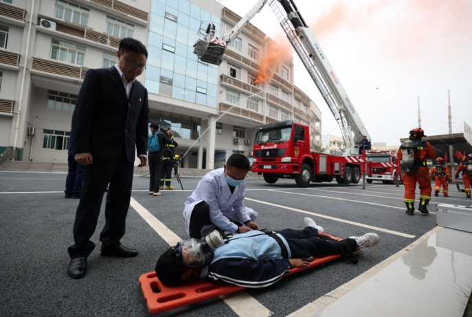 当天,演练还模拟教学楼四楼一教室发生火灾,学生们在任课教师的组织下按照预定路线逃生,但有一人被困教室,在四楼窗口处挥舞衣服求救。接到火警后,消防车和云梯车到达现场,在地面压制火势的同时云梯车迅速举升,将被困四楼的学生救下,并由120急救人员进行治疗。