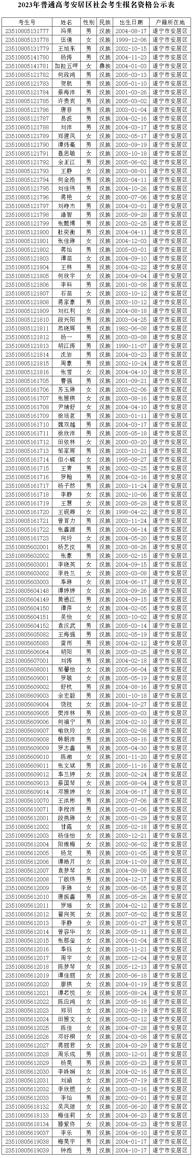 冯果等129名社会考生申请在我区参加2023年高考报名,根据省招委、省教育厅、省公安厅、省民委、省监察厅联合下发的《关于进一步加强我省普通高等学校招生全国统一考试报名资格审查工作的通知》(川招考委〔2009〕6号),省招考委、省教育厅、省公安厅、省统计局联合下发的《关于加强普通高校招生考生资格审核工作的通知》(川招考委〔2015〕26号), 省招委《关于做好我省2023年普通高考报名工作的通知》(川招考委〔2022〕56号),省考院《关于印发〈四川省2023年普通高等学校招生考务工作细则(报名阶段)〉的通知》(川教考院〔2022〕94号)以及市招委、市教体局、市公安局《关于做好2022年普通高考报名资格审核工作的通知》等文件精神,区招生办已经对冯果等129名考生的高考报名资格逐一进行了审查,全部符合2023年高考报名条件,现公示如下,接受大家监督,如有不同意见,欢迎举报。