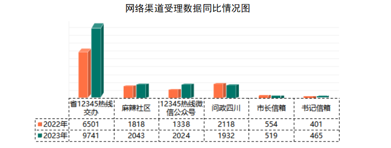从诉求来源看,2023年群众拨打热线电话占比97.97%。网络渠道受理16724件,同比增长31.37%,其中,省12345热线交办9741件,增长数量最多,达3240件;12345热线微信公众号受理2024件,同比增长51.27%,问政四川、市长信箱受理件数分别同比下降8.78%、6.32%。
