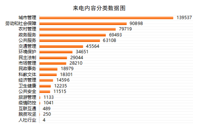 从来电内容看,2023年城市管理、劳动和社会保障、农村管理类问题较突出,位居前3,合计占比37.69%。具体问题主要集中在居民住房、市容环卫、养老保险、拖欠工资、农村建设、耕地保护等方面。