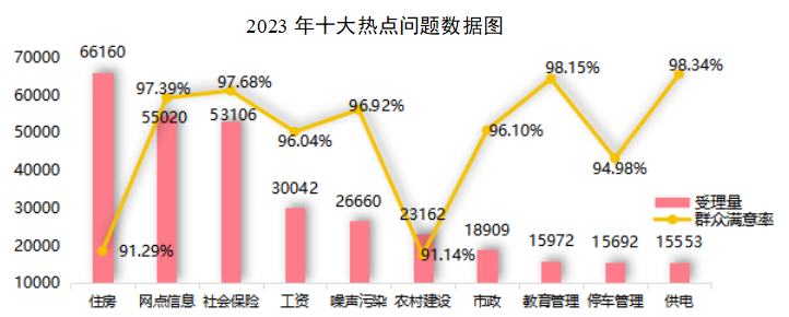 2023年热点问题集中在住房、网点信息、社会保险、工资、噪声污染等方面,十大热点问题合计32.03万件,占全年受理量的38.92%。主要呈现“5升5降”态势,市政、停车管理、农村建设、住房、噪声污染相关问题同比有所增长,增长较多的是市政34.66%、停车管理21.30%。供电、社会保险、工资、网点信息、教育管理相关问题有所下降,下降较多的是供电54.53%、社会保险20.91%。