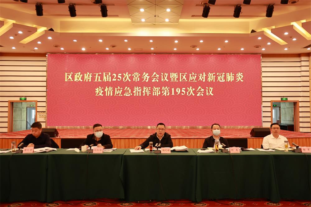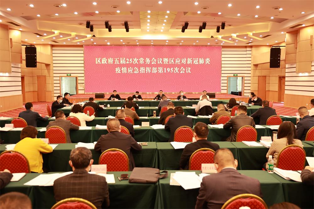 11月22日,区委副书记、区长、区应对新冠肺炎疫情应急指挥部指挥长杨文彬主持召开区政府五届25次常务会议暨区应对新冠肺炎疫情应急指挥部第195次会议,传达学习习近平总书记近期重要讲话、中央和省、市近期重要会议精神等,安排部署经济运行、疫情防控、铁腕禁毒、森林草原防灭火工等当前重点工作。