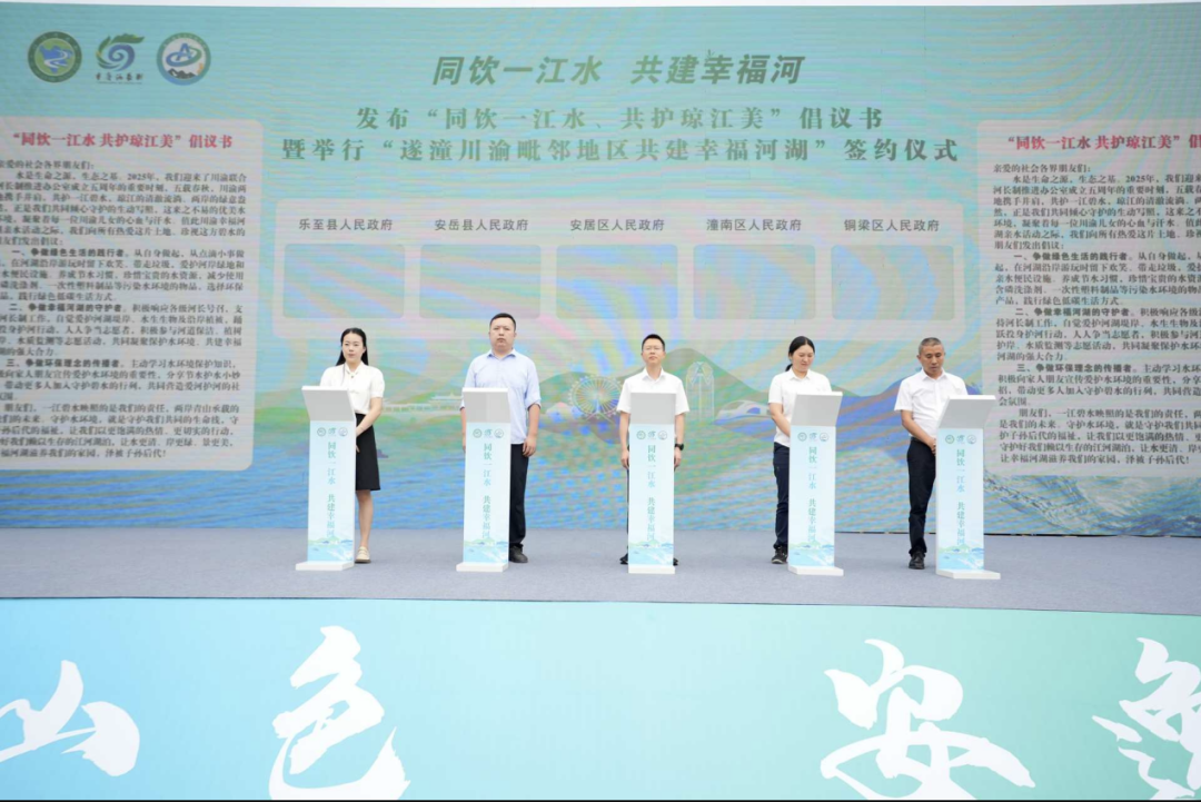 启动仪式上,乐至县、安岳县、安居区、潼南区、铜梁区五地代表共同签署了《遂潼川渝毗邻地区共建幸福河湖合作协议》,并向川渝两地人民发出《“同饮一江水、共护琼江美”全民行动倡议书》,标志着川渝毗邻地区河湖共治迈向新阶段。