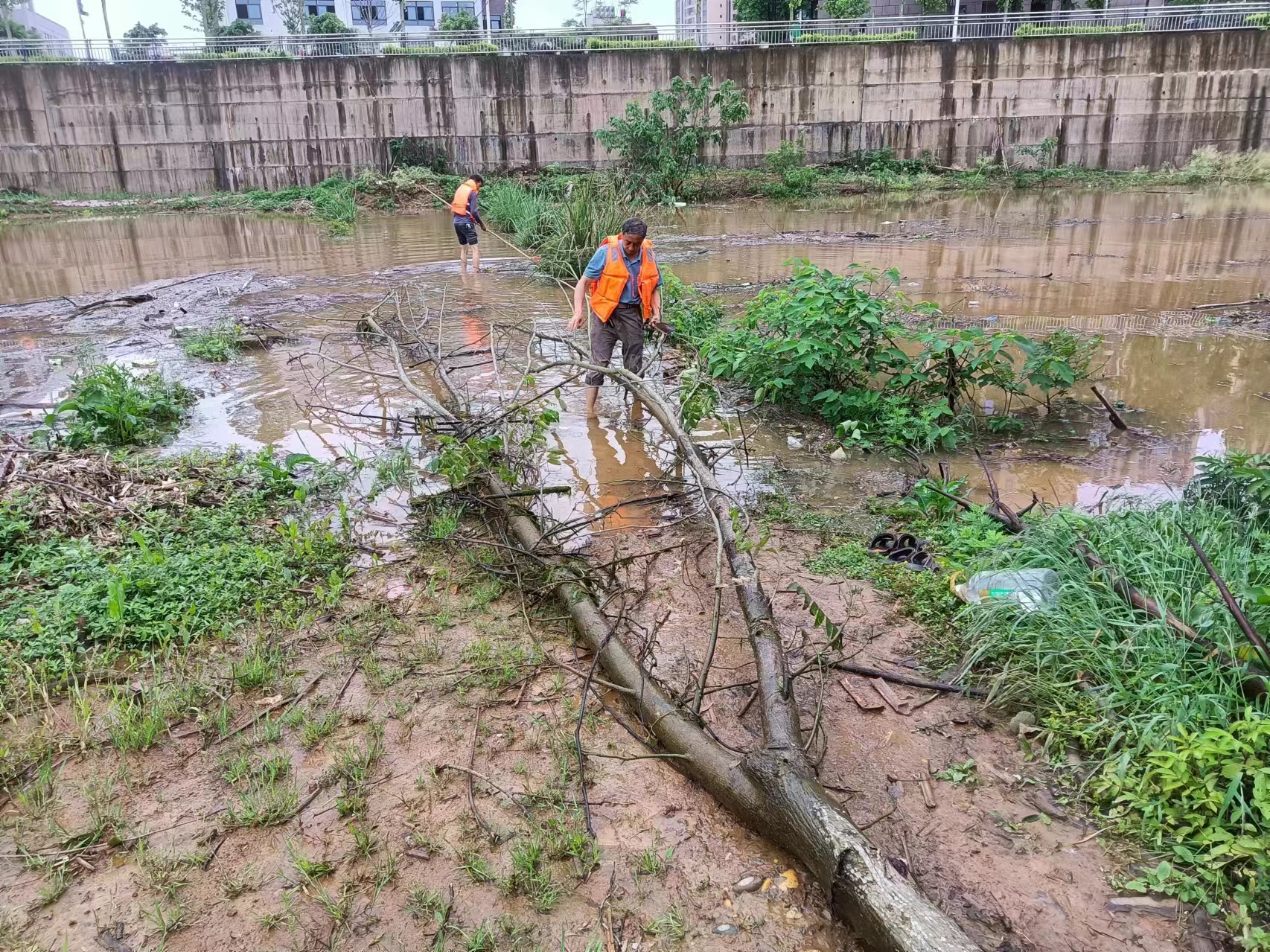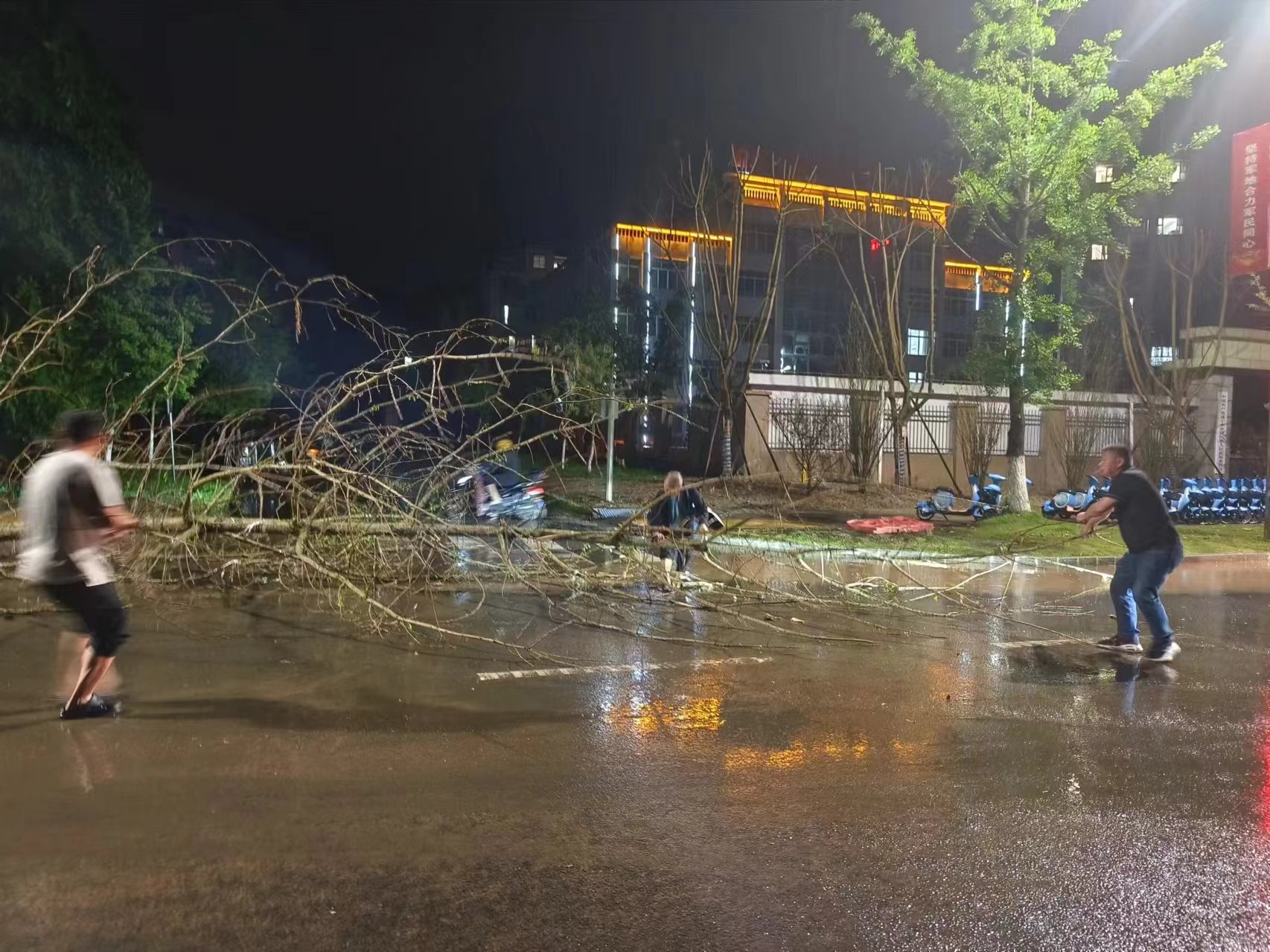 为做好防范暴风雨的相关工作,连日来,社区综合巡查员随时待命,接到险情通知便马上冲到最前,在狂风暴雨中坚持奋斗在第一线。道路内涝积水严重,巡查员一发现积水点立即赶赴现场,提醒行人和车辆的绕行;树木倒伏危及群众安全、影响交通,社区工作人员拿上工具带头排查隐患,冒雨清理路边倒塌的树干树枝,及时疏通道路,积极应急抢险等工作。