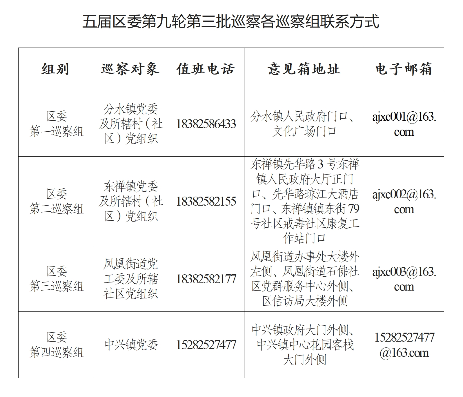根据区委巡察工作统一部署,区委组建4个巡察组对2个部门、8个镇(街道)、77个村(社区)党组织开展巡察。截至5月19日,区委4个巡察组对分水镇党委及所辖村(社区)党组织、东禅镇党委及所辖村(社区)党组织、凤凰街道党工委及所辖社区党组织、中兴镇党委完成第三批进驻。