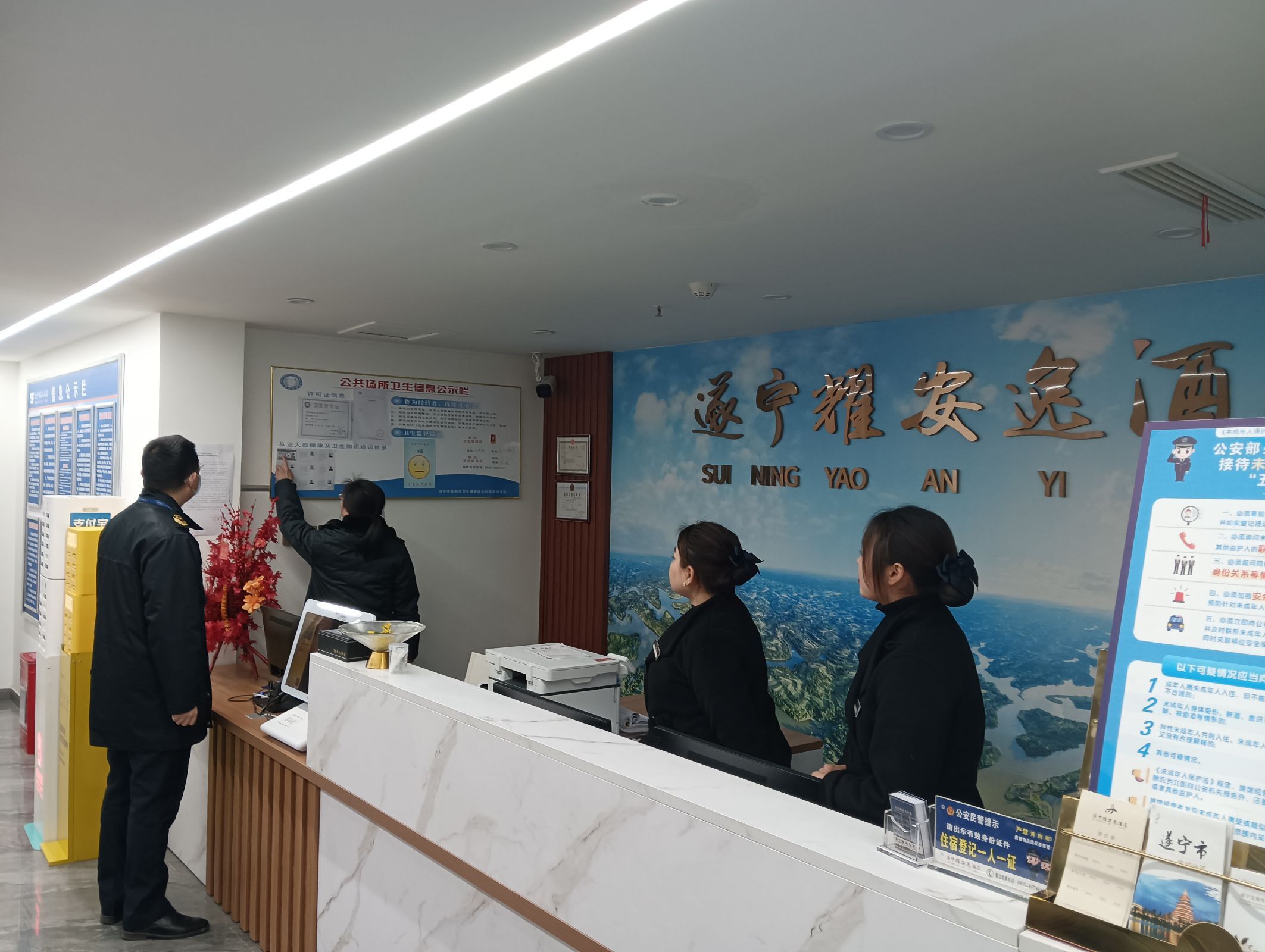 遂宁市安居区两会召开在即,为确保两会期间公共场所卫生安全,切实保障参会代表的健康权益。2月23日,遂宁市安居区卫生健康综合行政执法大队对接待酒店住宿场所进行了监督检查。
