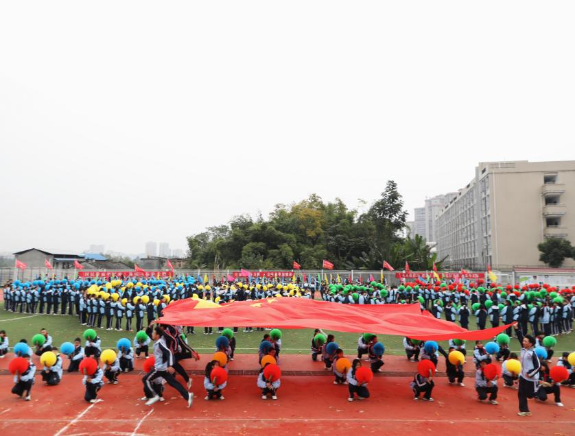 随着礼炮声响,2024年安居一中第二届师生运动会正式开幕。“奋斗一中,强国有我!”480名学生手持手翻花变色扇迅速切换队形、变换形态,展示出一中学子昂扬向上的精神状态。