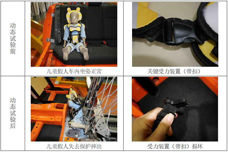 1.“儿童安全坐垫”的安全系带、卡扣等部件结构强度不足。安全坐垫与安全座椅的最大区别是材质不同,儿童安全坐垫一般采用柔性或半刚性材料制成,其结构强度低于安全标准要求,在模拟车辆发生碰撞的动态试验中,承受不了巨大惯性力出现破损或与汽车座椅分离,会导致试验假人飞出。