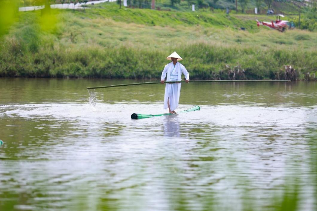 “这哪是划水?分明是水上轻功!”上午9:30,海龙湖面波光粼粼,国家级非遗“独竹漂”表演者踏一根青竹翩然登场,其手持长竿,时而灵巧转身、时而踏水前行,“乘风破浪”引得岸边观众连连喝彩。与此同时,老街与陈列馆广场上,两位“春花仙子”身着繁花汉服,在特制的花束上随风起舞,引得游客纷纷拍照留念。