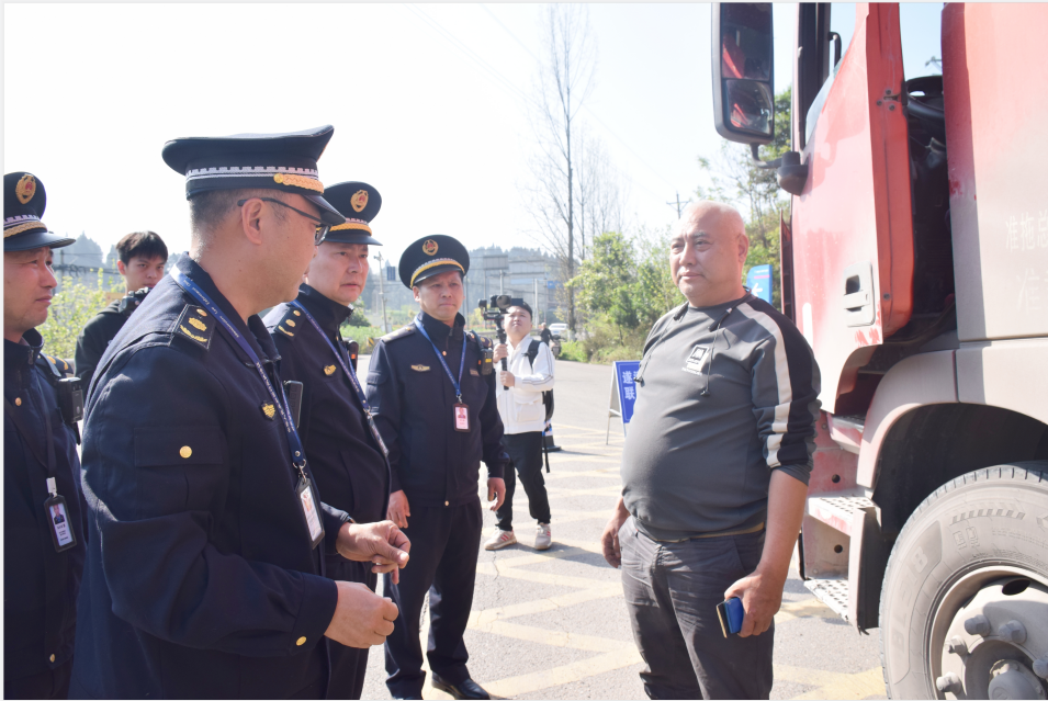 “请问你们从哪里过来?运输的是什么?”“车出厂的时候,货物一定不能超载,篷布一定要将车厢全部遮盖到位避免垃圾飞扬、污染环境,车身要清洗干净。”“路上一定要注意安全。”在G246与遂潼涪江创新产业园区道路三岔路口检查点,执法人员爬上一辆运输车货箱,查看篷布遮盖情况后,又掀开篷布仔细查验了货物;并请驾驶人出示驾驶证、行驶证、运输证等相关证件进行核验;检查完毕后,告知驾驶人相关法律法规。