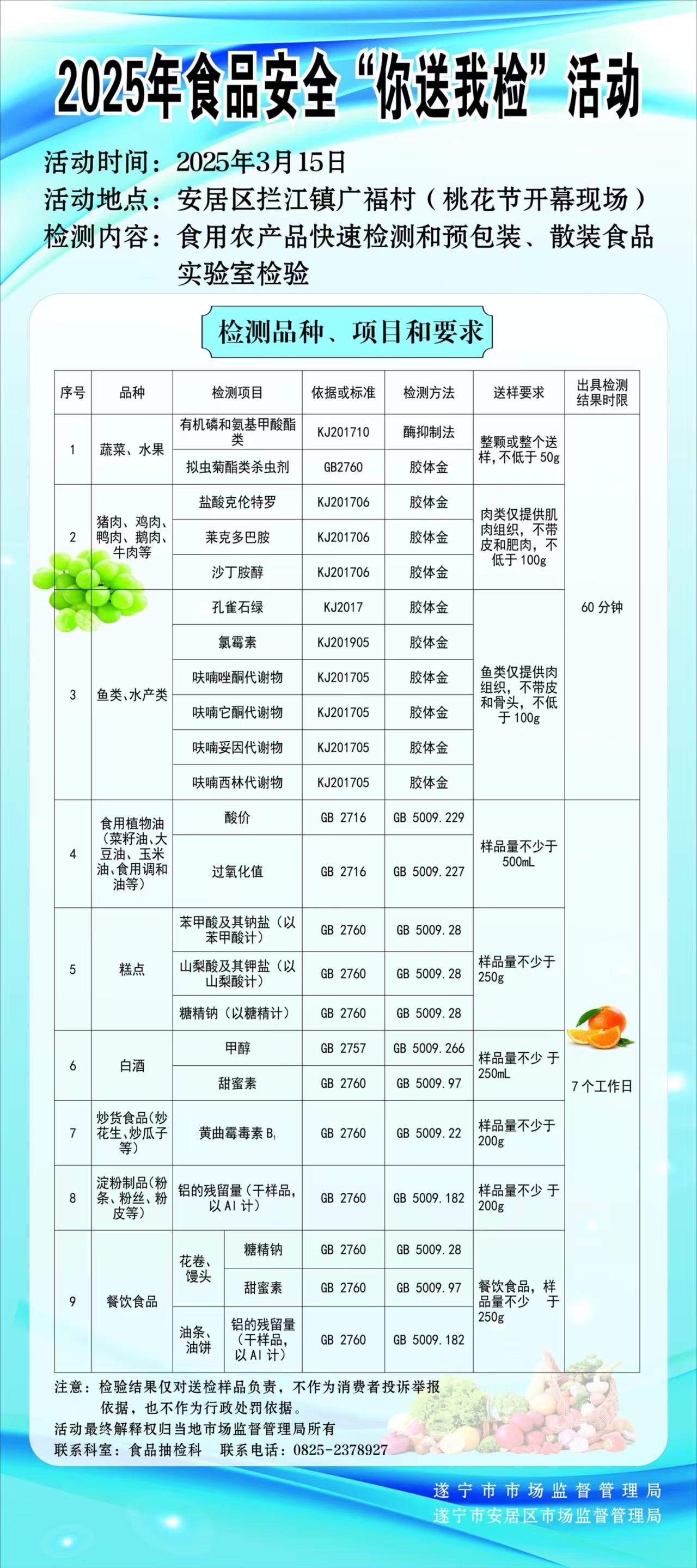 “你送我检”免费检测:携带您关心的食品(如蔬菜、肉类、干货等)到现场,专业检测人员将免费进行检测。(检测项目如下图所示)