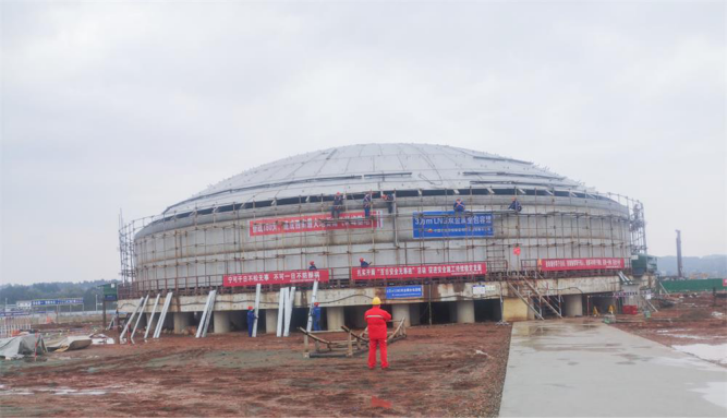 项目投运后储气设施达9万水立方米,应急储备能力达5400万立方米,满足川中地区上游气源故障时3天的需求量,实现每天96万标准立方米调峰能力,满足川中地区及周边500千米范围内的点供市场调整需求。目前项目一期穹顶骨架安装完成,穹顶板开始下料,抗压环安装完成,外罐底板安装及焊接完成,事故污水池基坑已完成验槽。