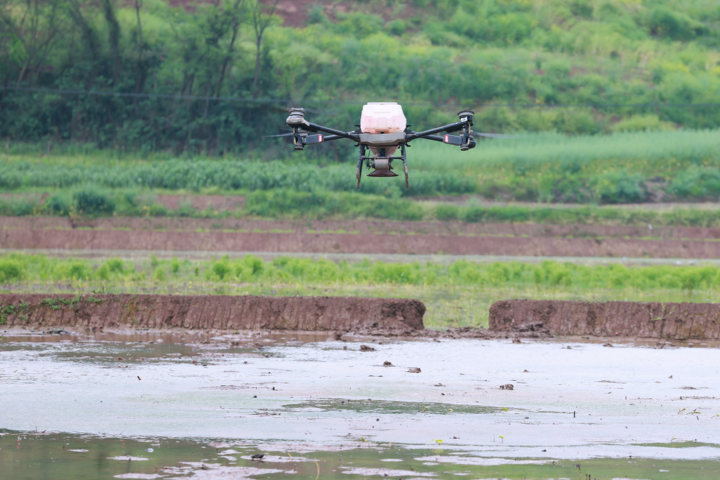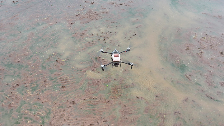 据悉,采用无人机进行水稻播种,相较于传统的育秧方式,省去了育秧、移栽等多个环节,并且不受地形影响,播撒均匀,种子成活率高。