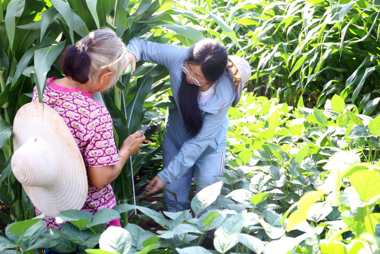 在安居辛苦耕耘两年,朱文雪找到了课题答案:在大豆玉米带状复合种植模式下,大豆受玉米荫蔽、西南地区气候条件等因素影响,极易发生旺长,具体表现为主茎过高,茎杆纤细,叶片肥大,落花落荚等现象,限制了大豆产量的提升。化控技术目前是解决大豆旺长问题,塑造良好株型最快速最常用的方法,本实验主要研究烯效唑和胺鲜酯复配剂的使用对大豆茎杆及叶片的调控,第一年研究结果表明,该调节剂的使用利于增加系统产量。