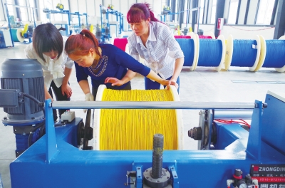 “公司的定位是走特种电线电缆生产加工路线,即通过对普通家装电线电缆进行再加工,最终形成阻燃耐高温的特种电线电缆。”广发辐照相关负责人告诉记者,特种电缆不仅使用寿命更长,其附加值也更高。待全面投产后,预计今年的年产值将达到1个亿。图为广发辐照厂房内,工人将生产好的电缆进行分装