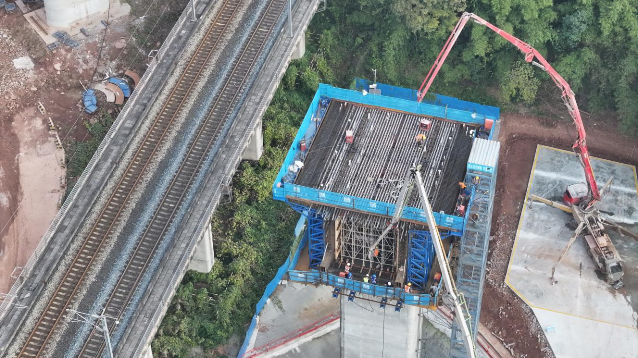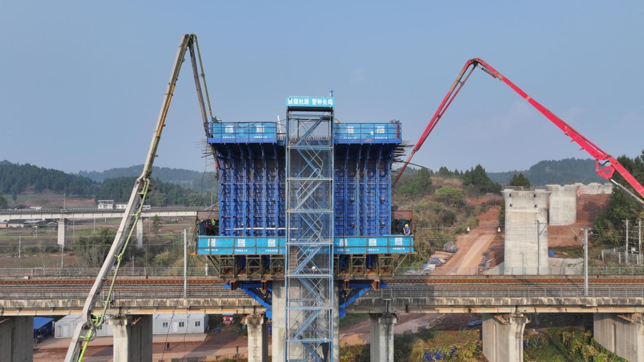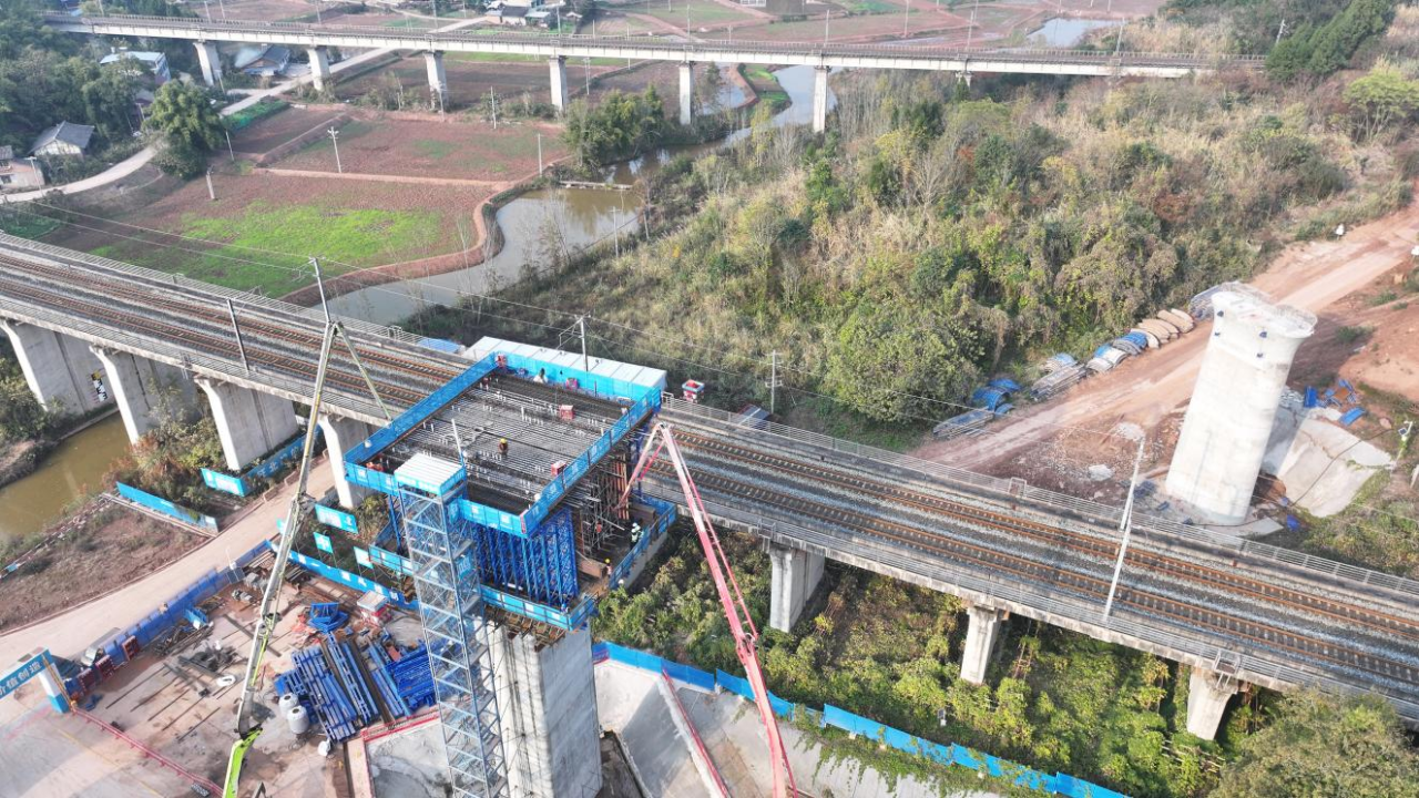 在横山镇德公村,成达万高铁全线高风险、重难点控制性工程——德公村特大桥37号转体主墩“0”号块混凝土浇筑顺利完成,标志着该桥上部结构施工进入新阶段,为后续桥梁转体对接奠定了坚实基础,完成了四季度重要节点。据悉,这也是成达万高铁遂宁境内完成的首个跨越既有铁路线转体连续梁“0”号块浇筑。