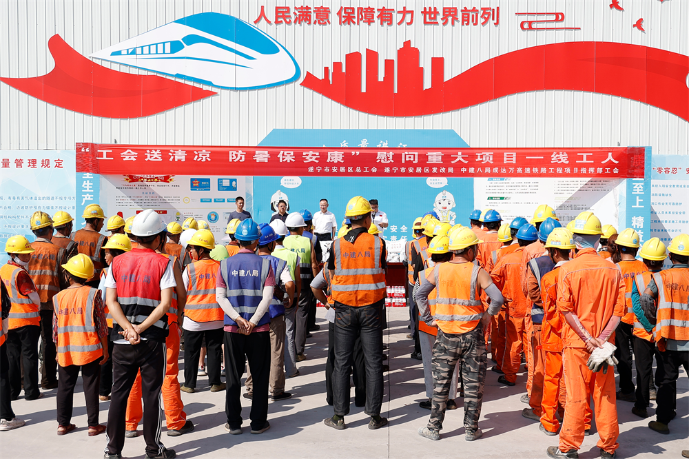 7月21日,区总工会、区发改局走进中建八局成达万高铁安居制梁场,开展2025年“工会送清凉·防暑保安康”慰问活动。