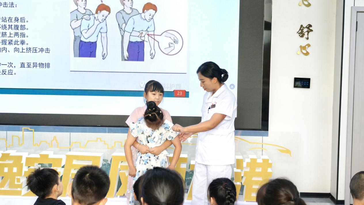 在实操环节,医护人员将专业急救知识转化为孩子们易懂易学的趣味课程。针对气道异物梗阻,独创的“剪刀石头布”口诀引发模仿热潮:“剪刀”比划肚脐上两指,“石头”握拳顶住,“布”手包住拳头快速冲击,7岁的轩轩现学现用,成功帮玩偶“咳”出了阻塞物。不仅如此,心肺复苏模拟和水中自救技巧让大家更直观的理解了这项重要的急救技能,小朋友们积极模仿,学得有模有样。