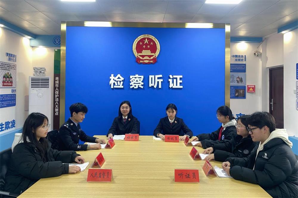 “现在,听证会正式开始!”揭牌仪式结束后,还开展了一场生动有趣的模拟检察听证。学生们化身检察官、民警、辩护人、当事人……大家各司其职,模拟了案情介绍、听证员提问等检察听证环节,沉浸式感受法律的神圣、庄严和温度,对于知法守法有了更清晰的认知。