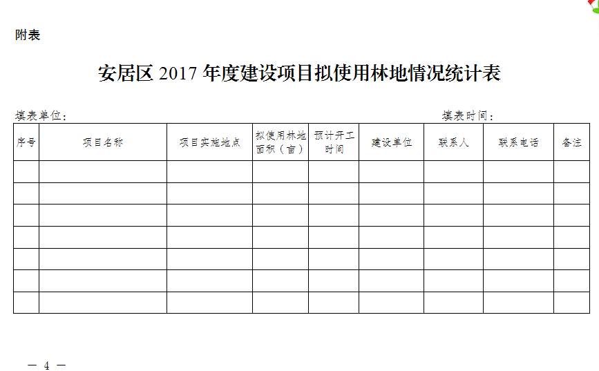 各单位务必要早谋划,早部署,及时清理本年度建设项目拟使用林地情况,填写《安居区2017年度建设项目拟使用林地情况统计表》于2月24日前加盖公章报区林业局,并及时完善项目报征相关手续,以便尽早转报省市林业主管部门审核审批,争取省级林地定额。