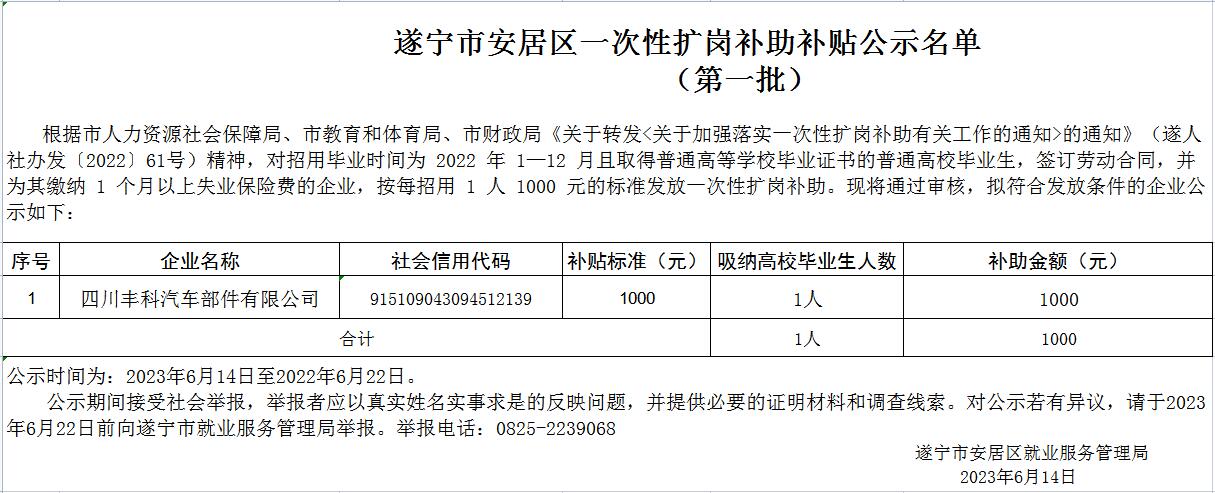 遂宁市安居区一次性扩岗补助补贴公示名单(第一批)