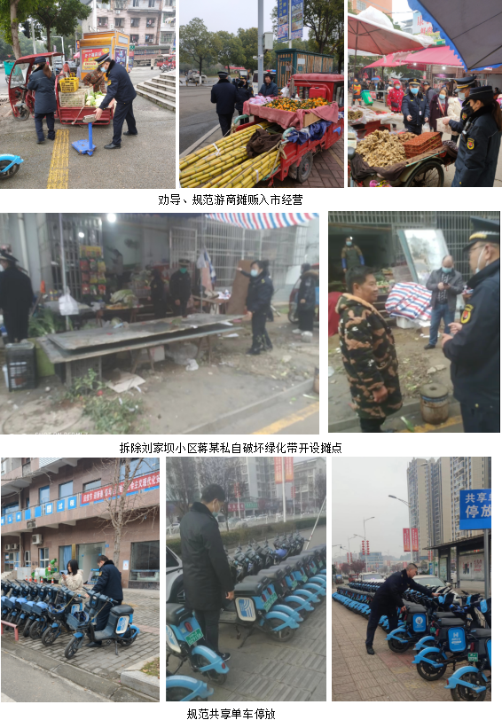 一是引导游商摊贩入市经营,营造良好的营商环境要求中队成员管理中做到“心勤、口勤、脚勤”,及时处理占道经营,本月累计引导、规范游商摊贩入市经营730余起,处罚刘家坝小区蒋某私自破坏绿化带开设摊点1起,共计罚款1000元。二是规范非机动车辆停放,为低碳出行提供便利。中队针对人流量较多的路段,加派了人手进行巡查,规范非机动车的停放,确保道路秩序;及时与遂宁骑安科技有限公司(共享单车)负责人取得联系2次,加强对共享单车的检修和维护,避免因设备出现的安全事故。三是加强街面常规巡查,死守安全生产底线。中队针对城市的公共空间、临街面飞线充电、户外广告、店招等存在安全隐患的地方进行巡查。本月共计出动260余人次,出动车辆20余台次,发现问题20余个,均已整改完毕。