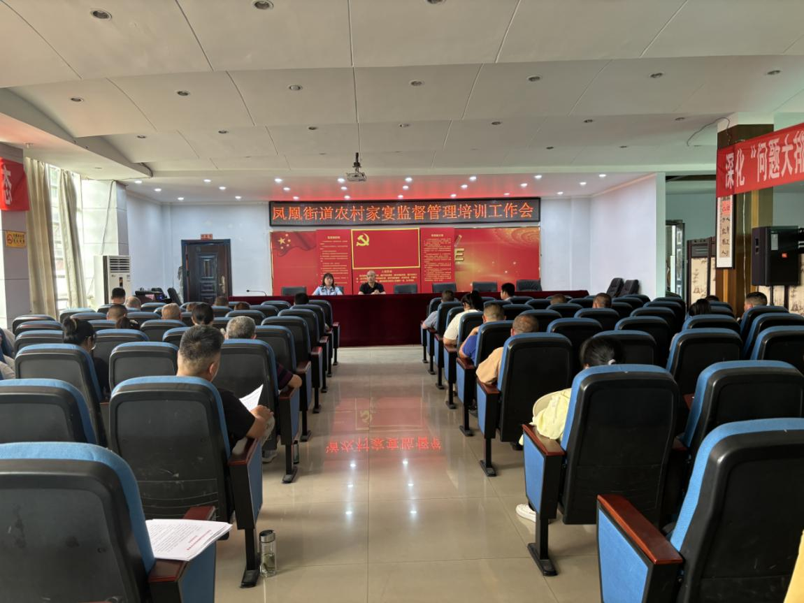 为进一步提高我街道农村集体聚餐管理水平,提升农村流动宴席厨师食品安全责任意识和业务素养,2024年5月20日,凤凰街道召开了农村家宴监督管理培训工作会,凤凰街道分管领导、市场监督管理局干部、17个社区书记、社区食品协管员以及流动宴席从业人员等参加会议。
