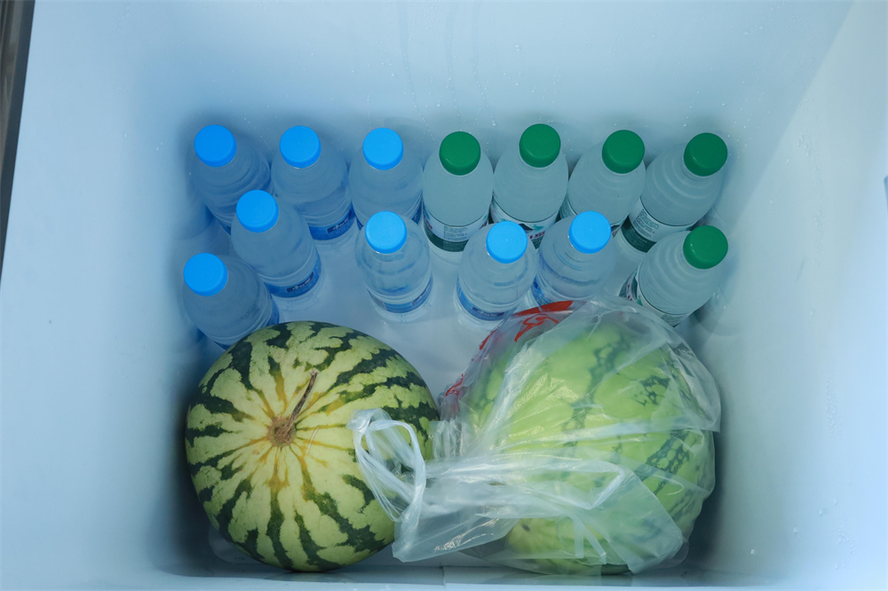 驿站内,环卫工人黄萍擦拭汗水,“热得受不了就进来歇歇脚,吹吹空调,吃点冰糕,还有备好的防暑药,水、西瓜等,实在太贴心了。”黄萍说道。