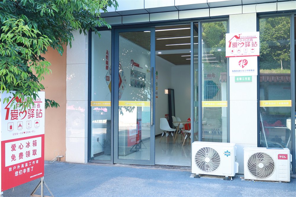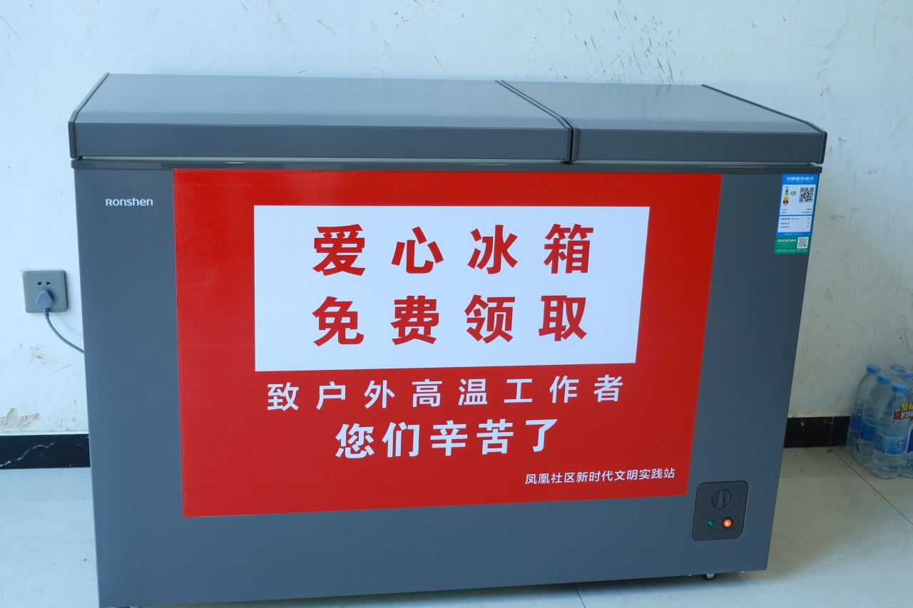 持续的高温炙烤大地,在凤凰街道凤凰社区新时代文明实践站打造的户外劳动者爱心驿站内,却是一片沁人心脾的清凉,正成为烈日下奔波的户外工作者们最温情的“清凉港湾”——空调凉风习习,冰糕、解暑药品、水果、饮用水一应俱全。