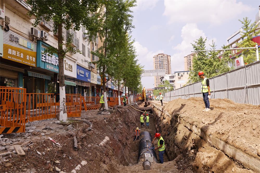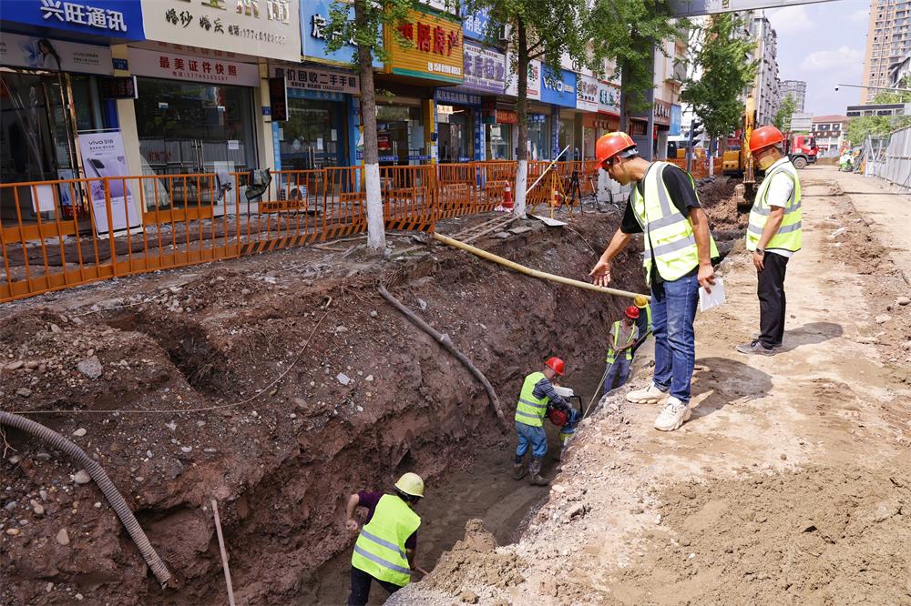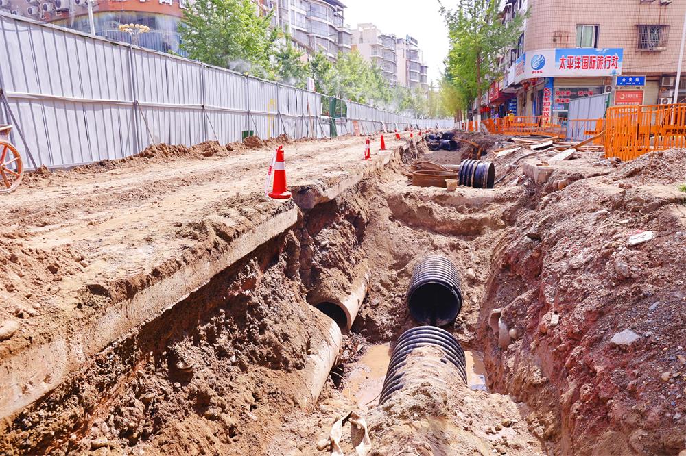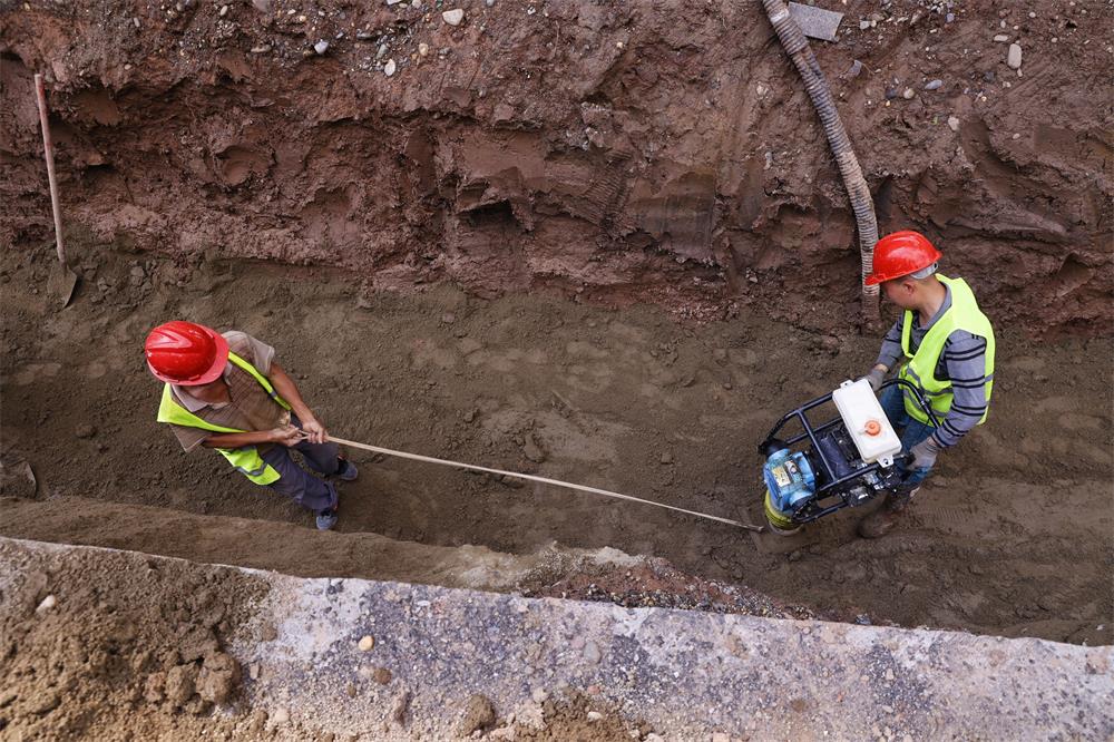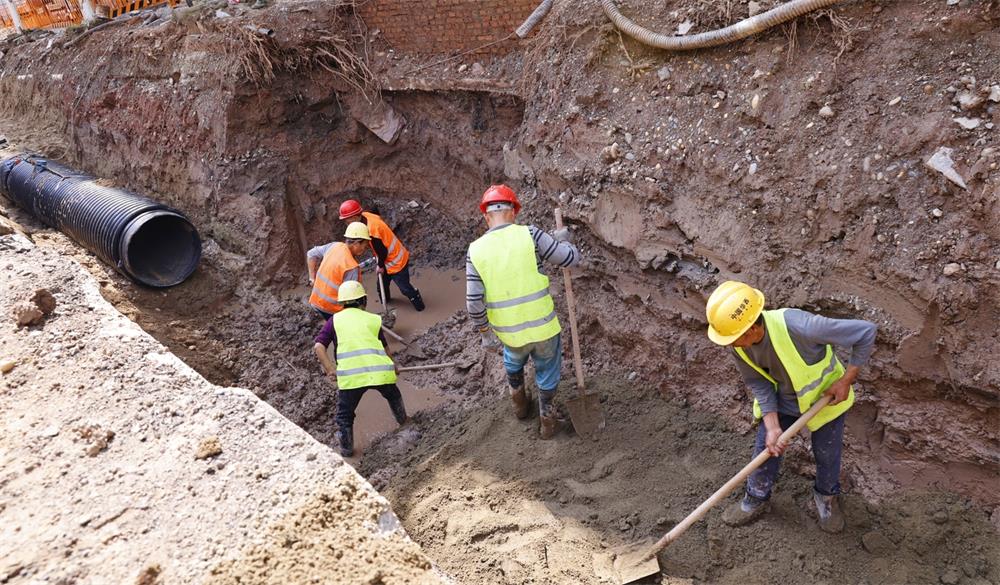 “目前,我们的主要作业是在道路以下的雨污水管网排布,平均每天的作业人数在20余人,每天基本能完成30米左右的雨污水管网布置、回填,预计本月底完成600米左右雨污水管道作业。”现场项目技术负责人谭坤说道。