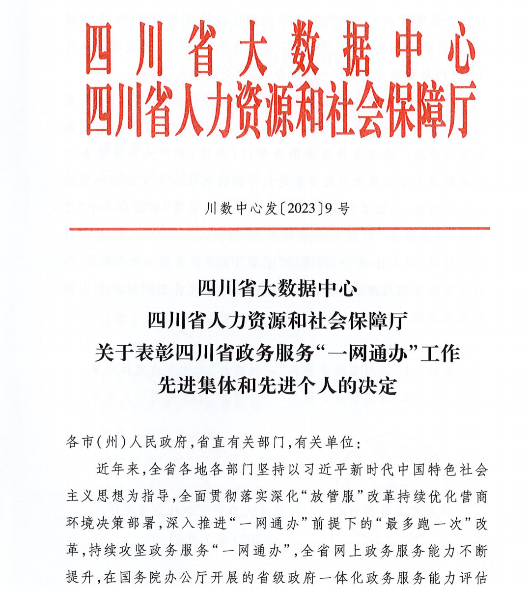 “四川省政务服务‘一网通办’工作先进集体”称号