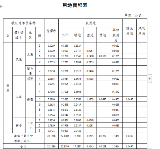 本次征收遂宁市安居区凤凰街道龙港社区1、2、6、9组,陷马堰社区2组;玉丰镇胡琴社区4组,新园社区1、4、5、6、8、9组;安居镇五垭子社区1、2、3组等土地共计22.1686公顷,用地面积见下图。