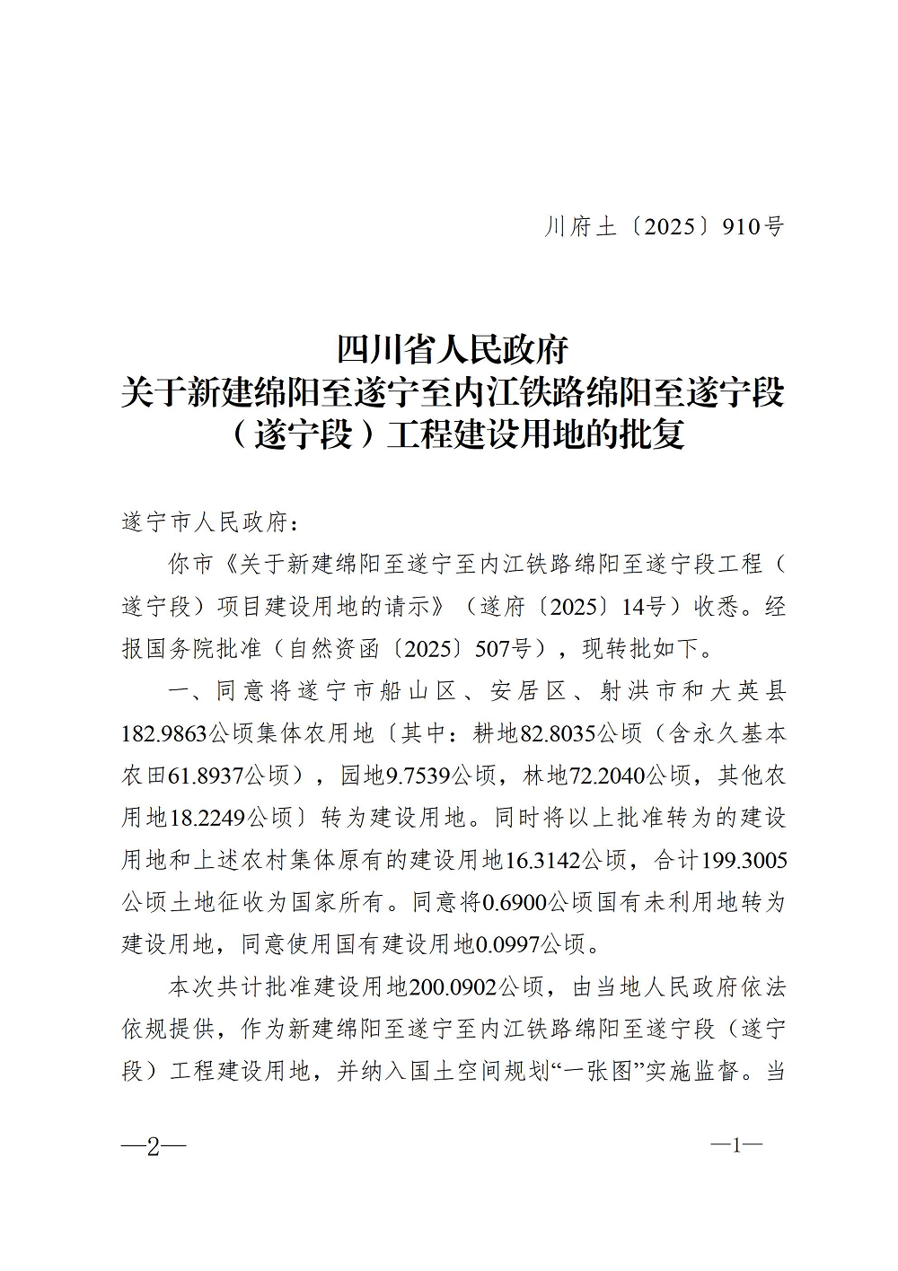 附件:1.新建绵阳至遂宁至内江铁路绵阳至遂宁段(遂宁段)工程建设用地的批复(川府土〔2025〕910号)