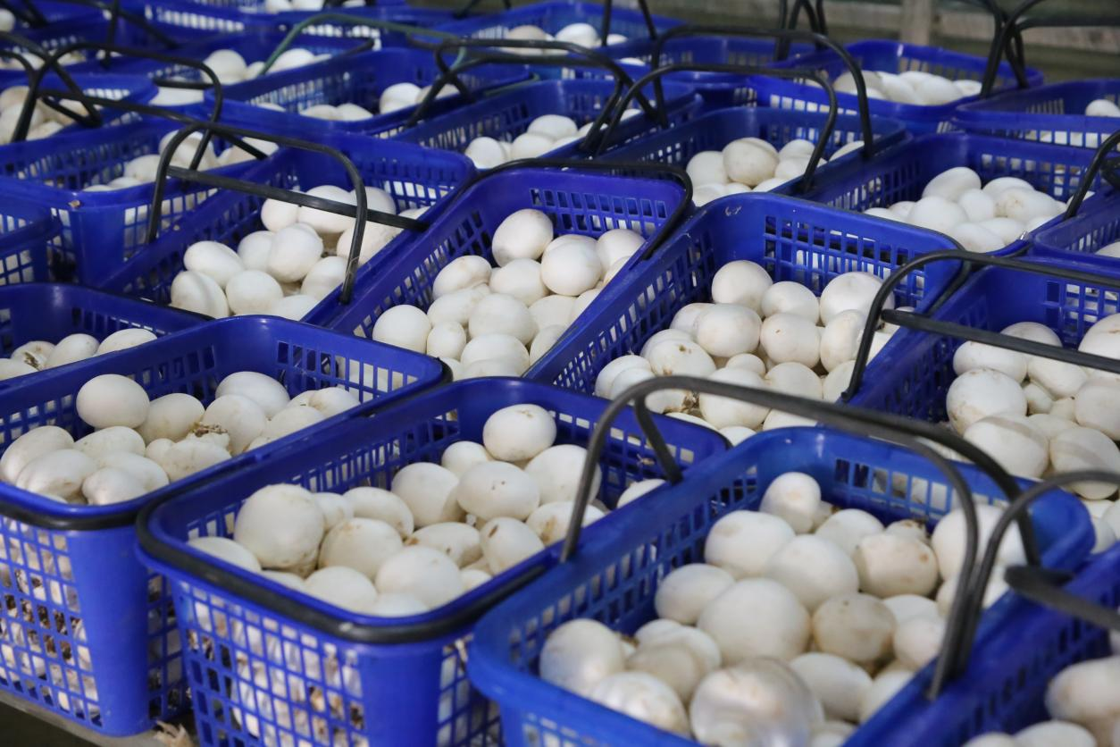 走进菇房内,清新的菌香四溢,乳白色灯光映照着菌床,一朵朵雪白的双孢菇如珍珠般探出头,圆润饱满的菌盖在架间错落有致。工人们手持篮筐穿梭其间,指尖轻捻便将成熟的菇蕾摘下,分拣、装篮、搬运……忙碌的身影与鲜嫩的菌菇构成一幅丰收图景。