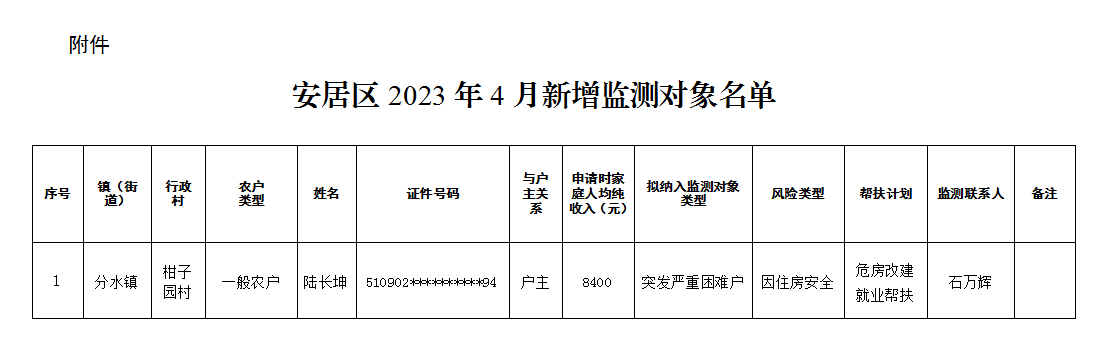 遂宁市安居区实现巩固拓展脱贫攻坚成果同乡村振兴有效衔接专项工作领导小组关于2023年4月新增监测对象名单的公告