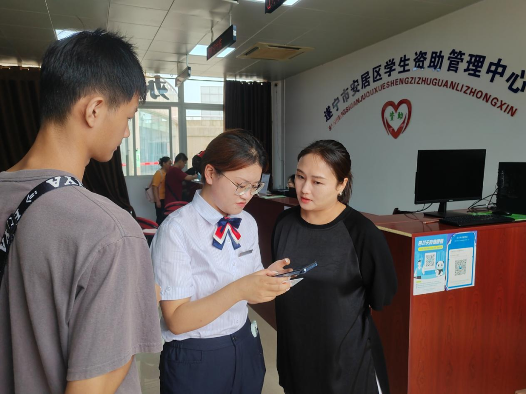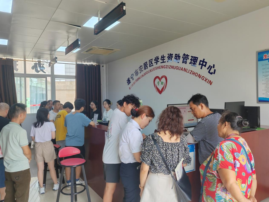 8月11日,在位于凤凰文化中心旁的安居区学生资助管理中心内,前来咨询和办理贷款业务的学生及家长络绎不绝。工作人员耐心细致地为每一位前来办理的人员讲解贷款政策、办理流程等相关事宜,确保大家清楚了解每一个环节。