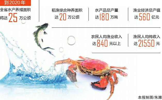 省政府办公厅日前印发《关于加快发展现代水产产业的意见》,瞄准农业供给侧结构性改革发力,加快建设现代水产产业强省。根据《意见》,到2020年,全省水产养殖面积将达25万公顷,稻渔综合种养面积达20万公顷,水产品总产量达180万吨,渔业经济总产值达560亿元,农民人均渔业收入达840元以上,渔民人均纯收入达21550元,比2010年翻一番以上。