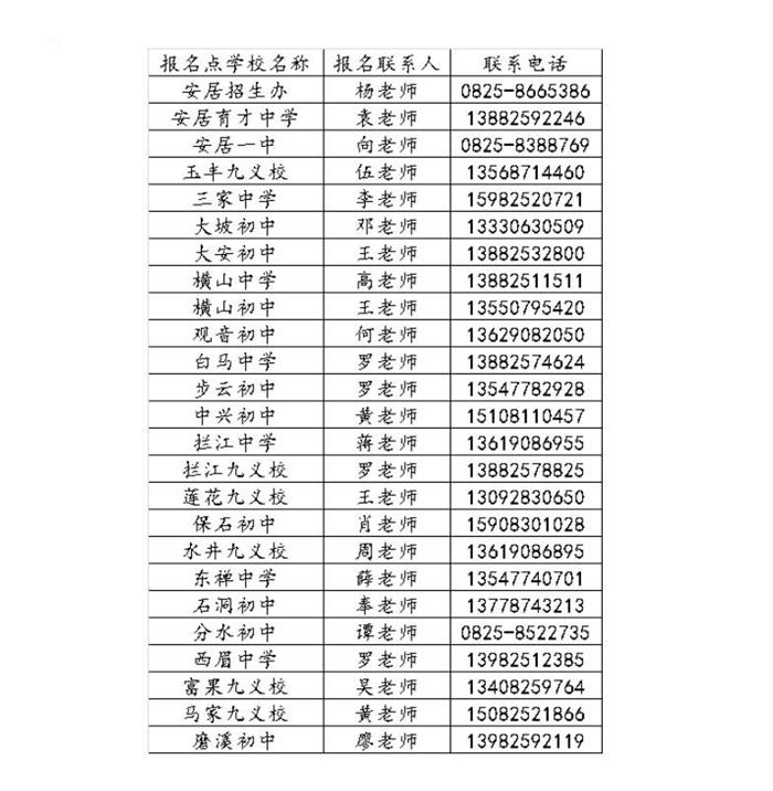 六、安居区2020年中考报名点学校及联系人