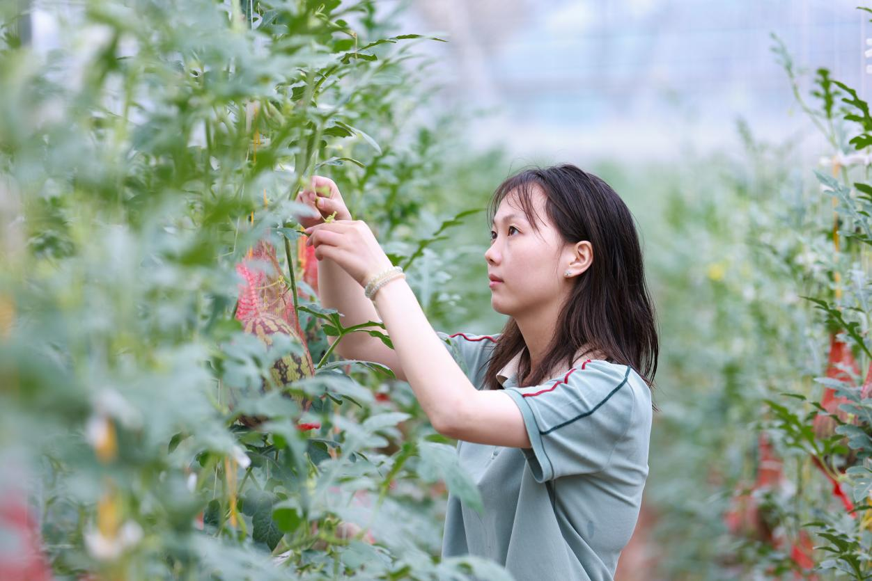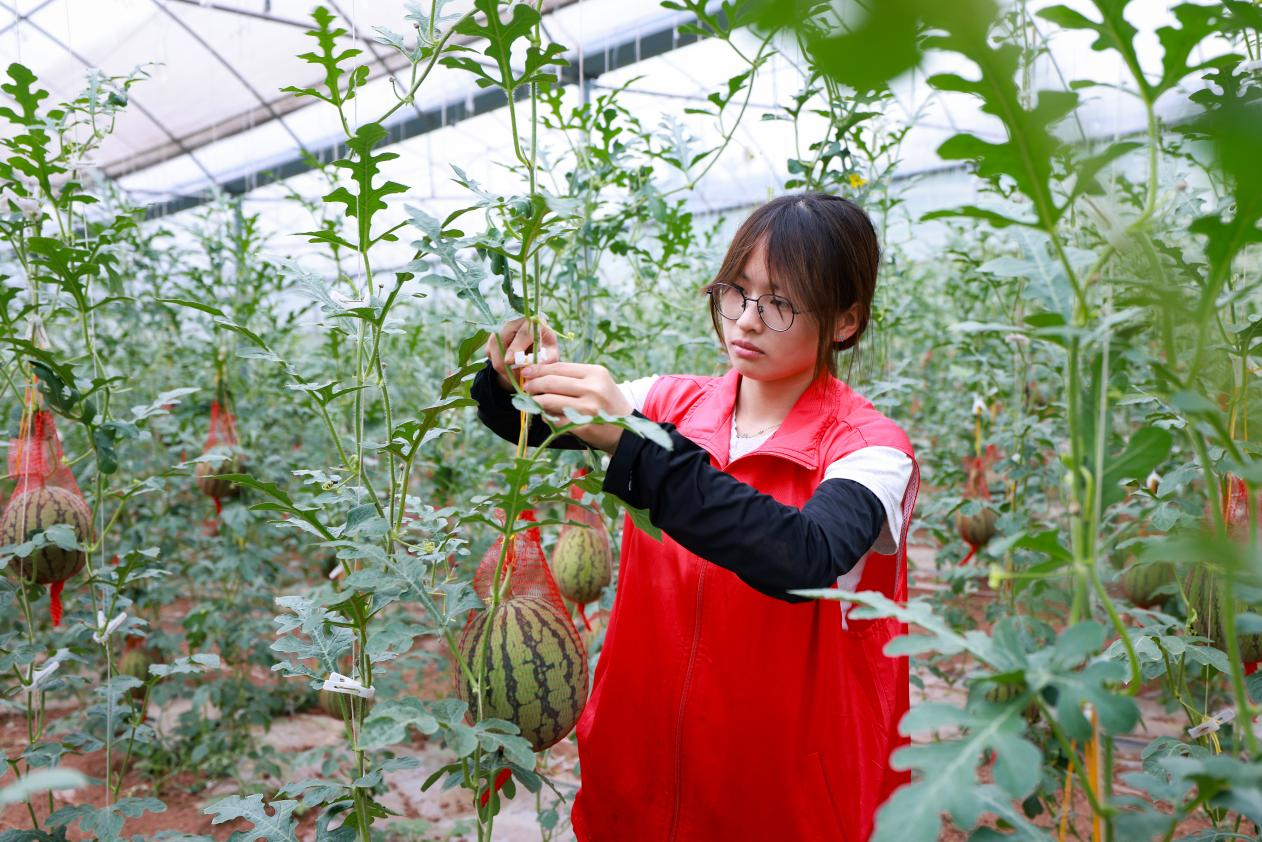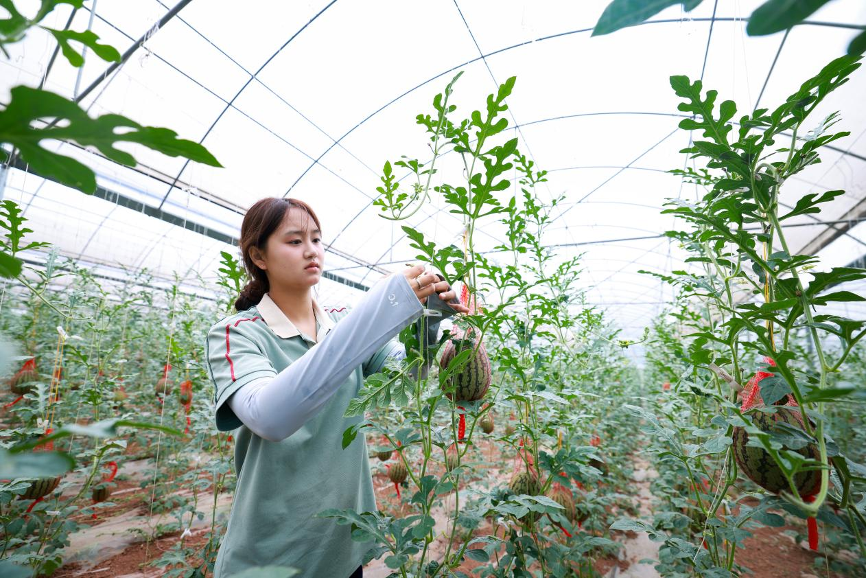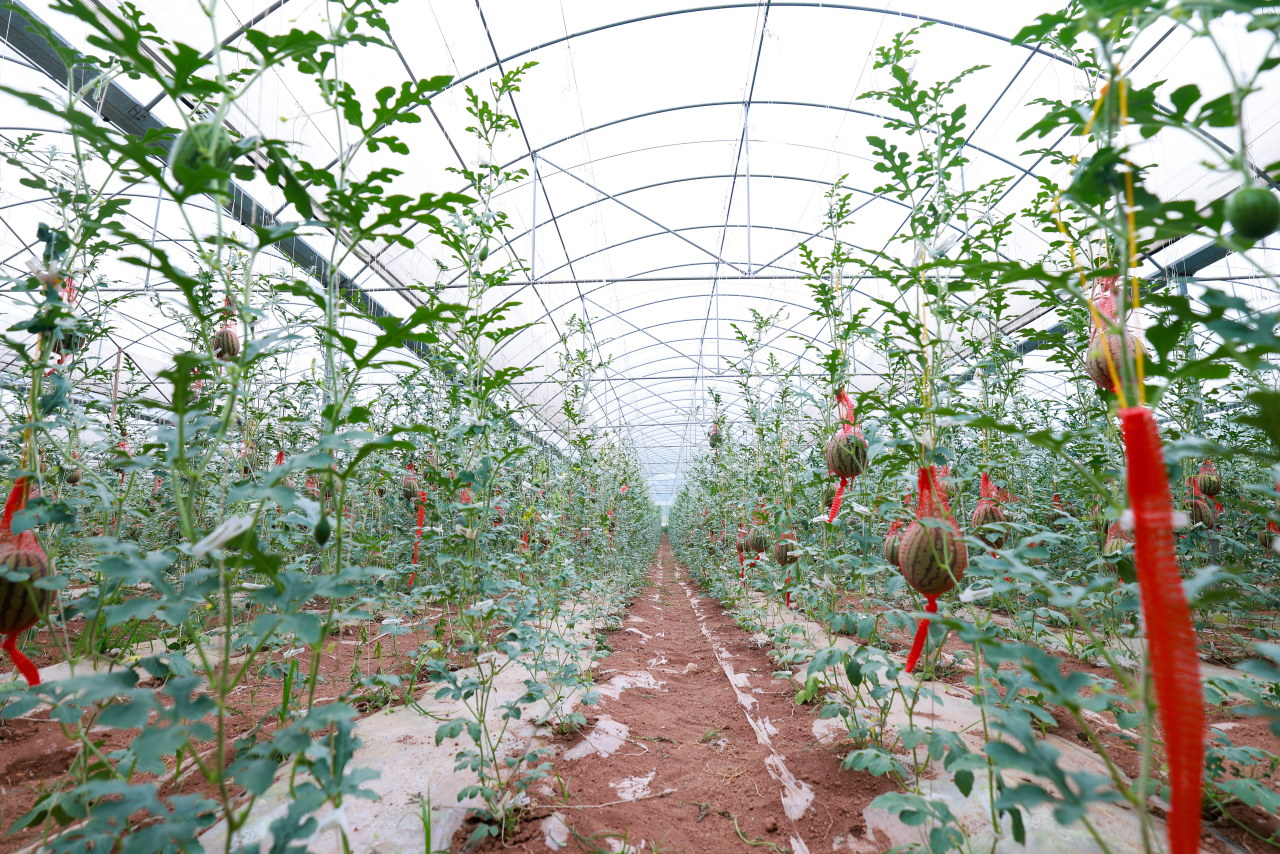 与传统种植方式不同,该基地采用吊蔓栽培技术,让西瓜和甜瓜藤蔓告别“贴地生长”,沿着支架攀援向上。新技术不仅极大改善了通风采光条件,有效减少了病害发生,还大幅提高了空间利用率,进而提高西瓜的品质与产量。