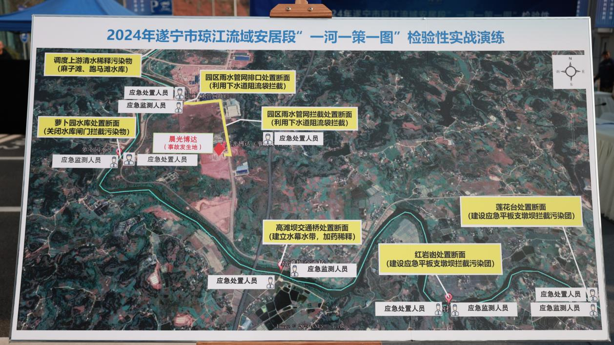 本次演练由两部分组成,第一部分模拟了四川晨光博达新材料有限公司浓度约为36%的盐酸泄漏,威胁琼江下游饮水安全。第二部分模拟了四川广发辐照科技有限公司发生辐射事故,威胁到人民群众的生命财产安全和辐射环境安全。